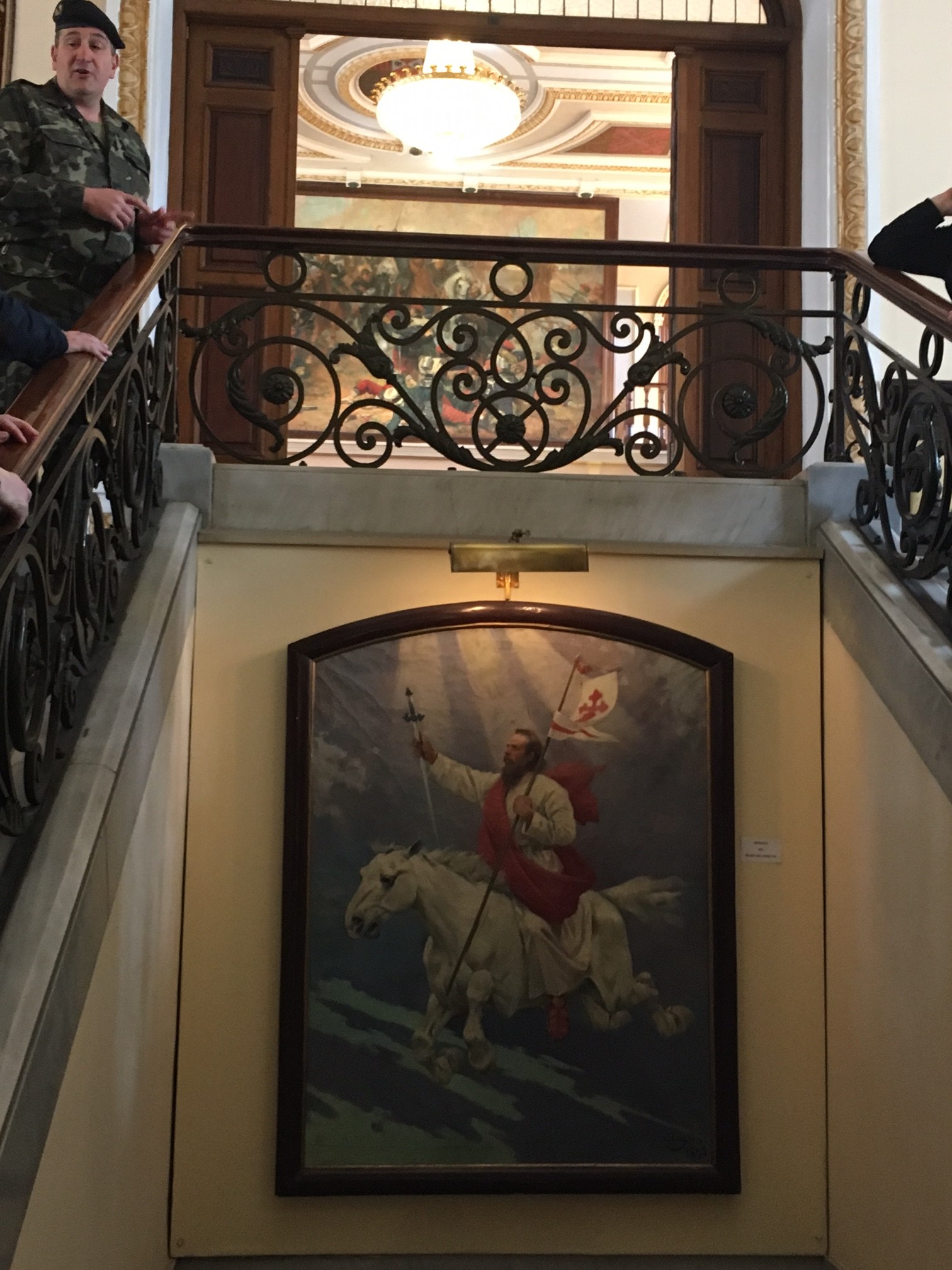 Un óleo de Cusach, retrato del Apóstol Santiago, patrón de la Caballería española, recibe al visitante. Curiosa es la técnica empleada por el ducho artista, que decidió pintar un caballo de escasa calidad para resaltar la figura del santo. El lienzo es la antesala al Salón de actos, la estancia más noble de la Academia. En su techo se repiten las insignias de las cuatro órdenes militares de Caballería, acompañados aquí por las armas de los Borbones y el antiguo escudo de Valladolid.