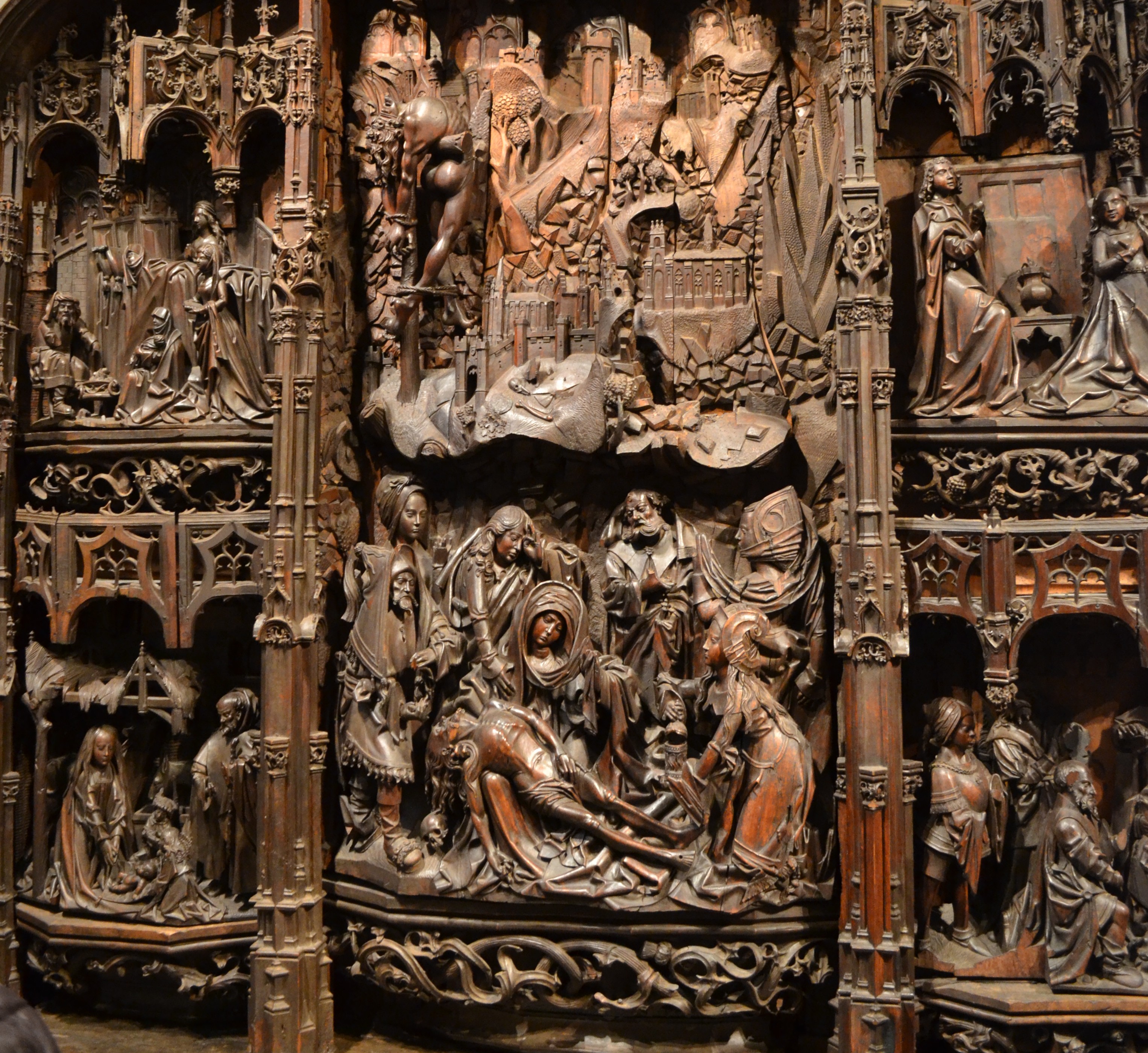 Destacamos también un retablo realizado por Jorge Inglés (1455) que condensa los principales rasgos de la pintura gótica (profusión de detalles en el paisaje, tratamiento trágico de la figura humana…). Otro retablo destaca, precisamente, por ser romper con la tendencia castellana por la forma de su caja o las escenas. Además, a diferencia del resto de retablos, no es policromado. Su excepcionalidad lo convierte en una joya única.